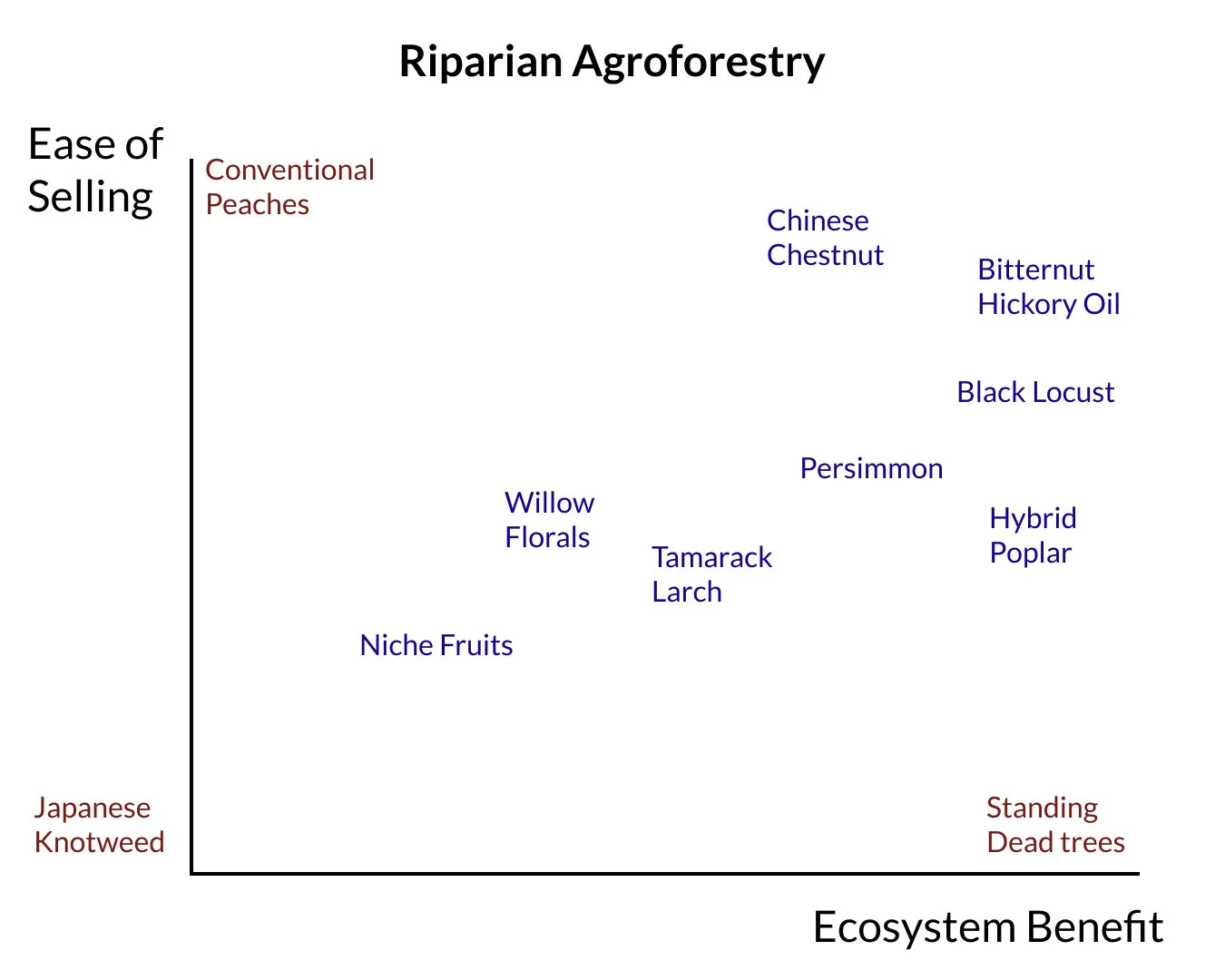 On-farm riparian zones can and should yield marketable farm products. Market goods such as fence posts, lumber, nuts, and fruit can compliment and maintain the public goods (water quality, food mitigation) that riparian buffers create for society. If riparian zones are viewed as acres that create asset value and yield income, rather than liabilities to be resentfully dealt with, farmers and land managers can move beyond an arms-length or adversarial relationship with the agencies and NGOs tasked with managing the quality of the water that runs off of farmland.