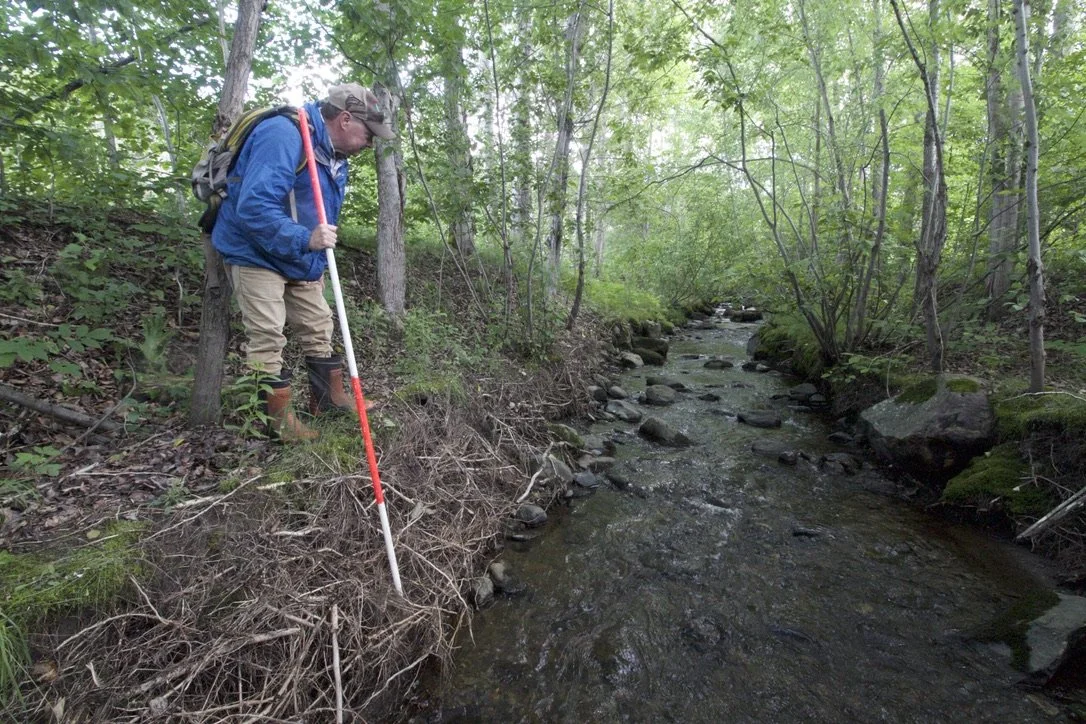 Dr. Benoit Truax of the Eastern Townships Forest Research Trust walks through a planned riparian buffer he planted 16 years ago to hybrid poplar and native hardwoods. The buffer is extremely effective at catching sediment, absorbing runoff, and shading the stream.